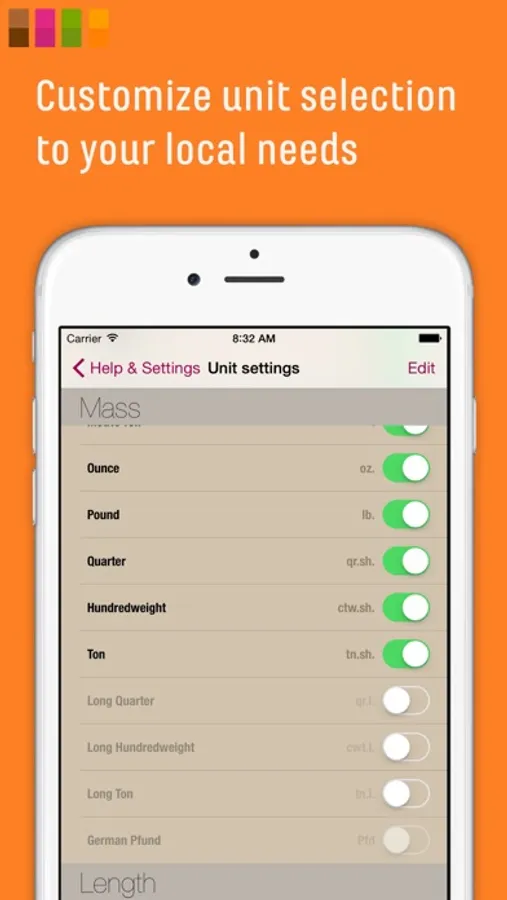 Volume: liter (l), milliliter (ml), centiliter (cl), deciliter (dl), hectoliter (hl), cubic meter (m³), cubic millimeter (mm³), cubic centimeter (cm³), cubic decimeter (dm³), cust. fluid ounze (fl oz), quart (qt US), liquid pint (pt US), dry pint (dry pt US), liquid gallon (gal US), dry gallon (dry gal US), bushel (bu US), petrol barrel (bbl US), Imperial quart (qt GB), Imperial pint (pt GB), Imperial gallon (gal GB), bushel (bu GB), cubic inch (cin), cubic foot (cft), cubic yard (cyd).