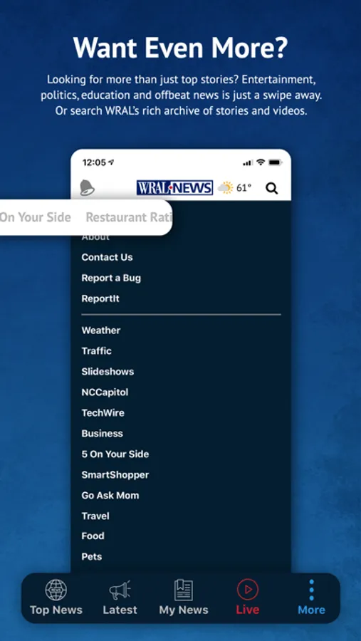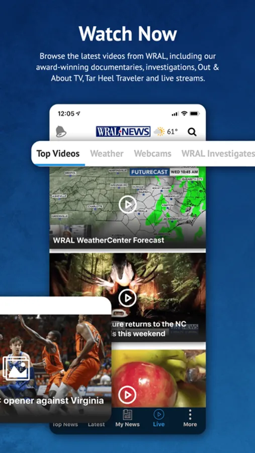 • Use "Watch" to browse the live streams and the latest videos from WRAL, including our award-winning documentaries, investigations, webcams across the state, Out & About TV and Tar Heel Traveler.
