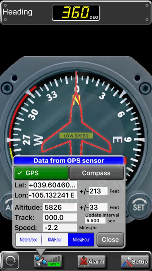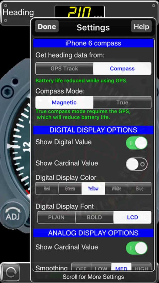Displays a photorealistic aircraft style heading indicator on your device. Modeled after analog instrumentation in general aviation aircraft. The meter movement is smooth and realistic.