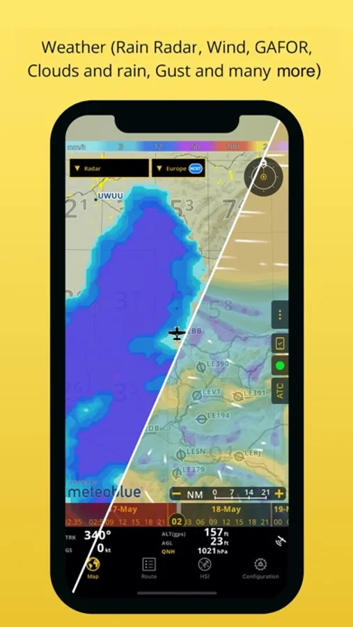 Review weather forecast for up to 3 days ahead! You will be able to see on top of the moving map, the following data: Rain Radar, Wind, Pressure, Clouds and rain, Visibility, Gust and GAFOR (CH&DE). Create your flight briefings including weather charts and graphs. Weather data are updated every 24 hours with a 1 hour interval.