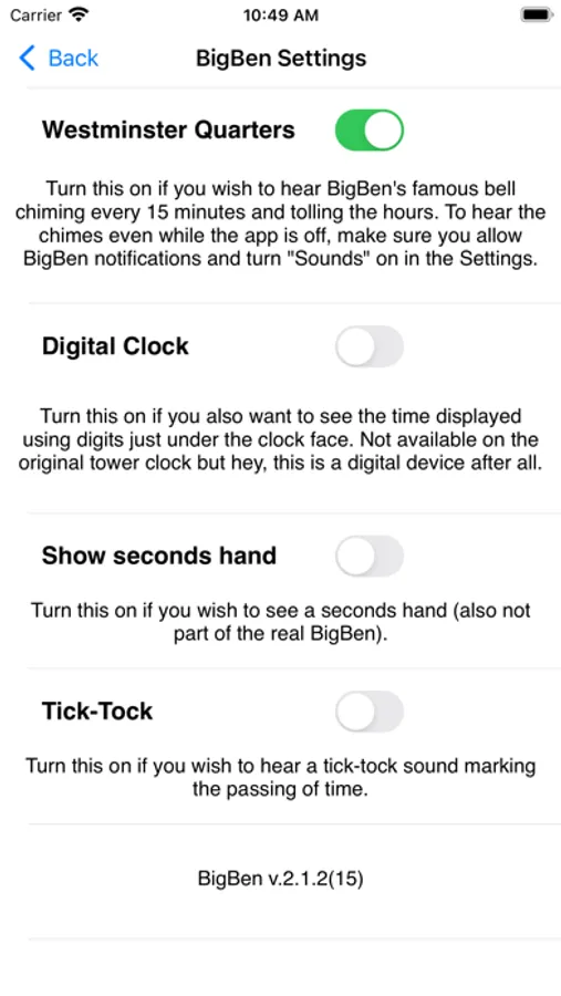having it chime every quarter of an hour and toll on the hour (the chiming and tolling sounds will play even when the app is not open, so long as your device is not muted and you allow notifications in the General Settings for Big Ben)