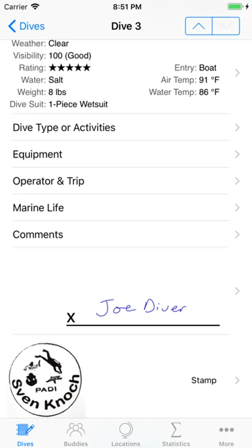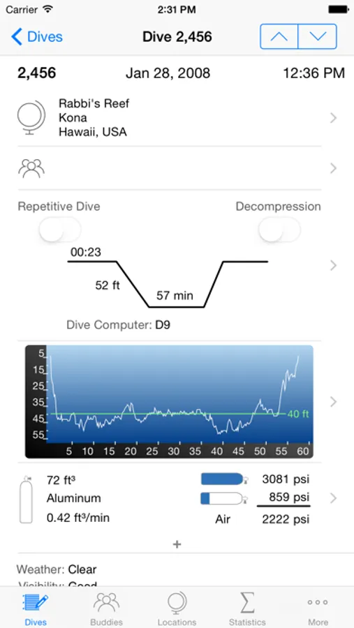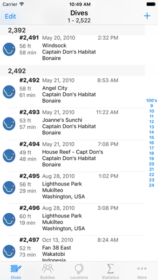Dive Log is designed to work either as your primary SCUBA diving logbook application or in conjunction with compatible 3rd party desktop logbook applications. You can use Dive Log at the dive site or on the dive boat to capture the information about the site while it is fresh in your mind (or your dive guide's mind). You can even capture the GPS coordinates of the dive site using the built in location services of your iOS device. Details about your actual dive can be added immediately after your dive or at the après dive event and later be saved to your desktop computer. The dive buddy feature is fully integrated with Contacts on your iPhone or iPad, letting you capture information about your newest dive buddy or quickly add an existing buddy to a particular dive. The dive data and statistics features let you have an immediate answer the next time your dive guide asks how much weight you used on your last dive or have all the information you need about your dive history when you fill out that next dive waiver. Metric and Imperial values are supported for all appropriate logbook fields. You can easily enter values using the appropriate units for the situation and view them in your preferred measurement system. You can even explore detailed dive profiles from popular dive computers that you download with your desktop software and later upload to Dive Log on iPhone/iPad. Dive profile data can also be transferred directly from certain dive computers directly via Bluetooth or using a supported Bluetooth accessory and an associated in-app purchase.