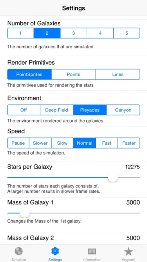 The parameters of the simulation, such as the number of galaxies and stars, masses, etc. can be changed interactively to explore the infinite number of possible interactions between the galaxies.