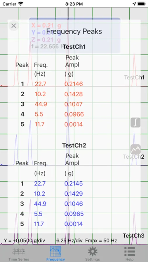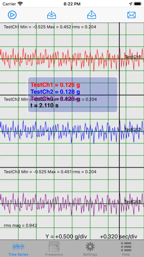 • Document your results by taking screen snapshots and syncing them to your computer or sending a CSV formatted email with the time and frequency data to your computer or saving data locally and downloading the data with iTunes