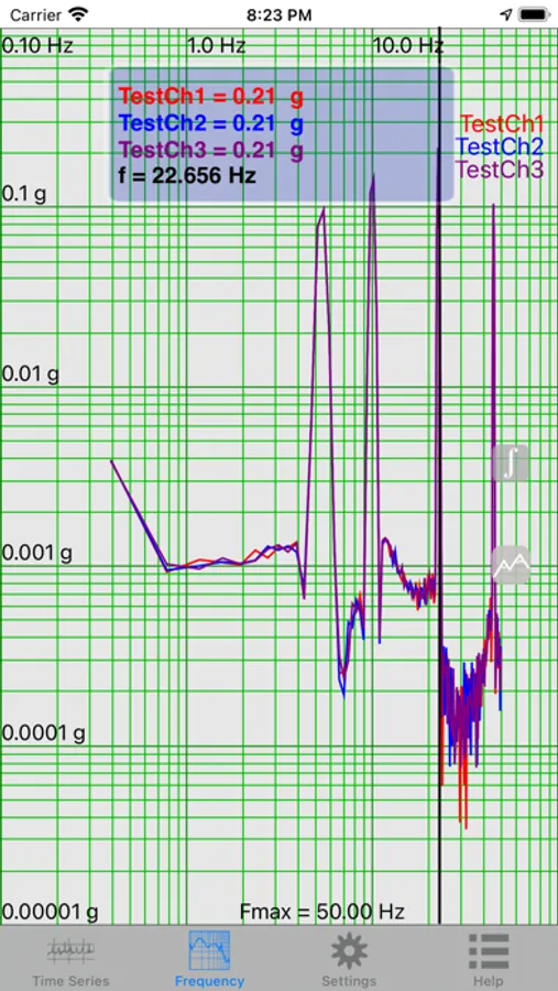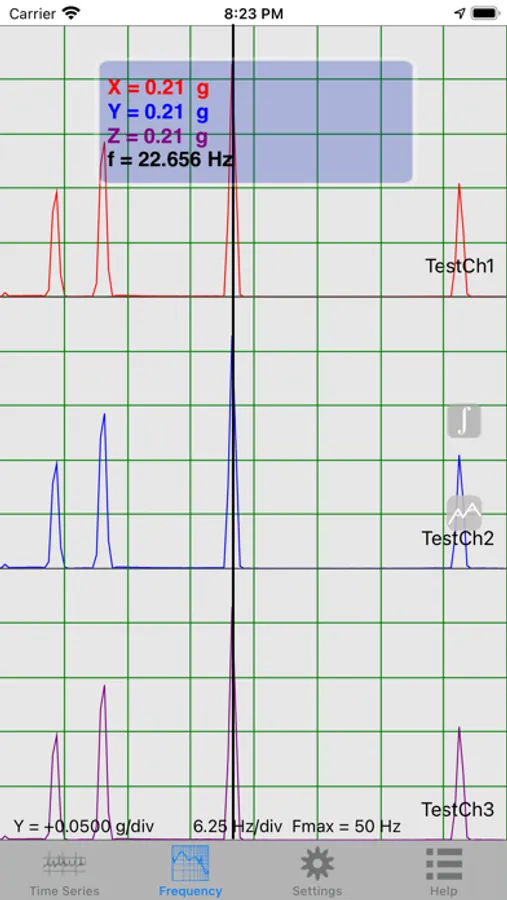 Vibration is a true vibration spectrum analyzer using the built in accelerometers and gyroscope inside the iPod Touch and the iPhone and starting with version 3.x it can sample the built in microphone and the Digiducer professional quality external USB accelerometer. It acquires and displays time series data, optionally removes DC bias, applies a Hamming window and performs an FFT on each channel to produce frequency spectra. The 3-channel accelerometer has a sensitivity of approximately 0.02g and a range of ±2g making the iPhone and iPod Touch sensitive enough to analyze the vibration of most moving machinery.