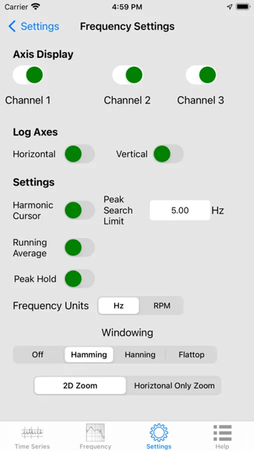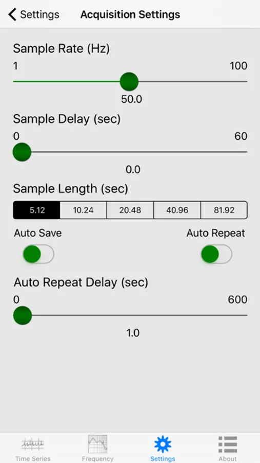 The software is flexible and easy to use. It was written to emulate the familiar oscilloscope based spectrum analyzer. Sample rate and sample delay are easily adjustable and the user can select the length of the data acquisition and the vertical scale used for the display. Once the settings are configured simply press the sample button on the device or on your Apple Watch. When a test is complete the resulting data can be emailed to your desktop computer for documentation purposes.