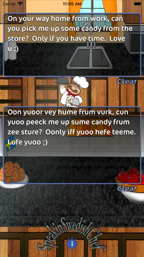 Hej! Velcume to Speakin Swedish Chef. Put a funny new twist on your conversations by translating all your messages to sound as if you have the chef's swedish accent. With this easy to use application you can type a message and translate it in the tap of a button, then message it to your friends.