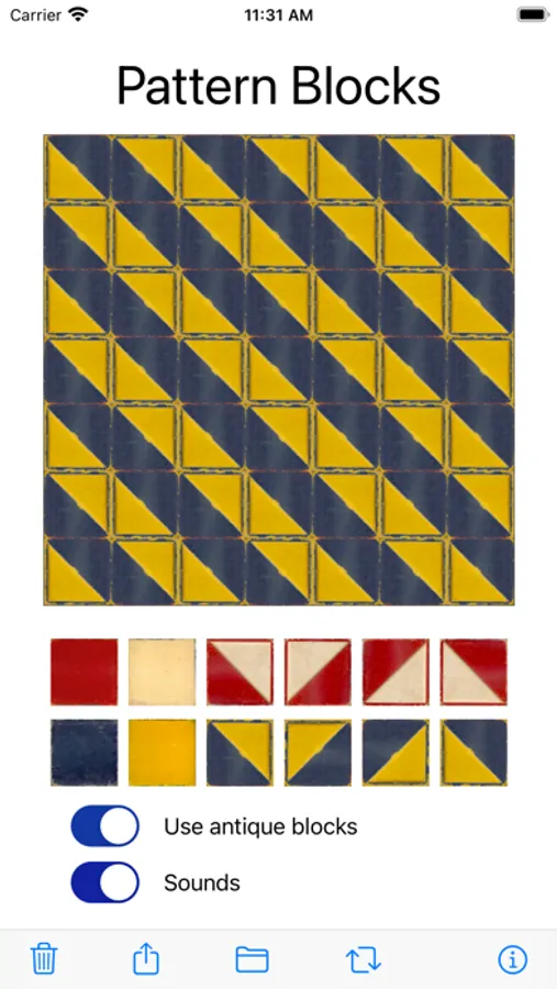 Pattern Blocks is a game that lets you drag blocks around to create interesting mandala-like designs. It is based on an actual set of antique blocks that I played with as a child on my grandmother's living room floor.