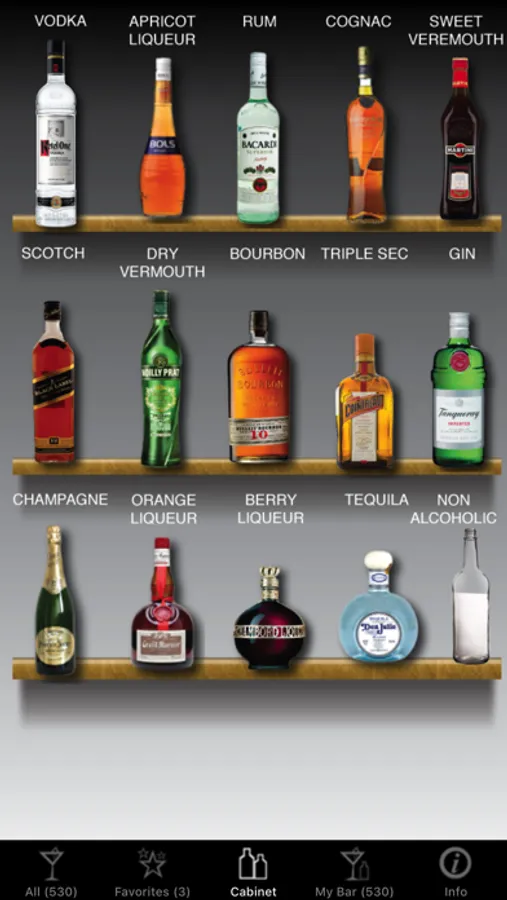 - Mark bottles you already own in the 'Cocktail Cabinet' to see which drinks you can make.