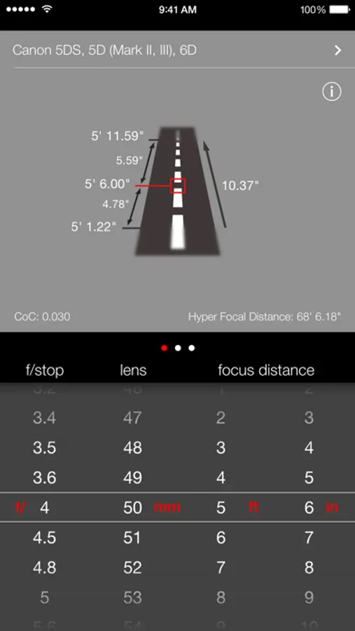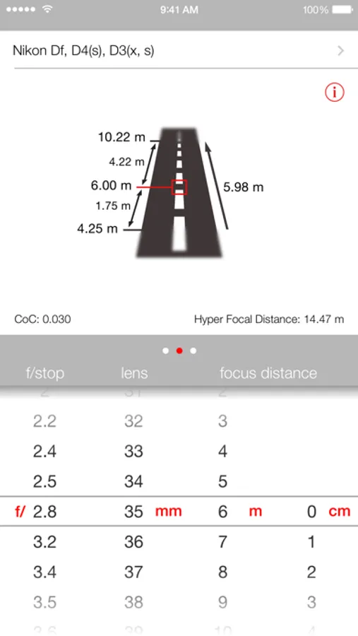 Simple DoF Calculator allows photographers to calculate the depth of field and hyperfocal distance for any given settings. It calculates the near limit, far limit, total depth of field, hyperfocal distance, distance in front of the subject and distance behind the subject.