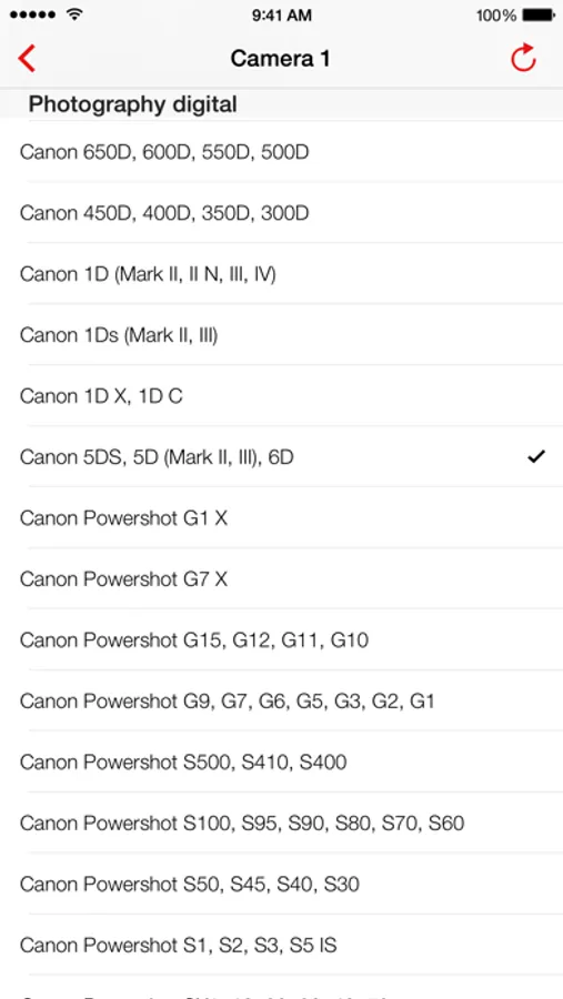 Your camera isn't on the list? Let us know and we'll add it. With the refresh button you'll see if there are new cameras available and the app will download them immediately.