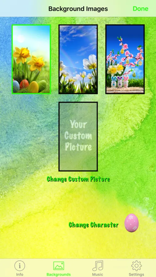 While listening to music (built-in or your own), see the number of days countdown until Easter. Watch the animated characters get bigger as Easter gets closer displayed on the included background images or use your own picture.