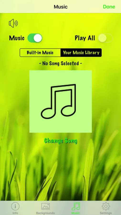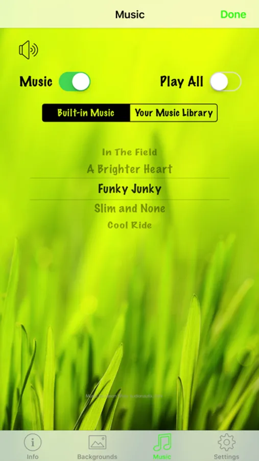 • Select one of 5 background musical soundtracks. Select one or automatically play all the songs in a repeating sequence. Select Airplay to play the music to your Apple TV.