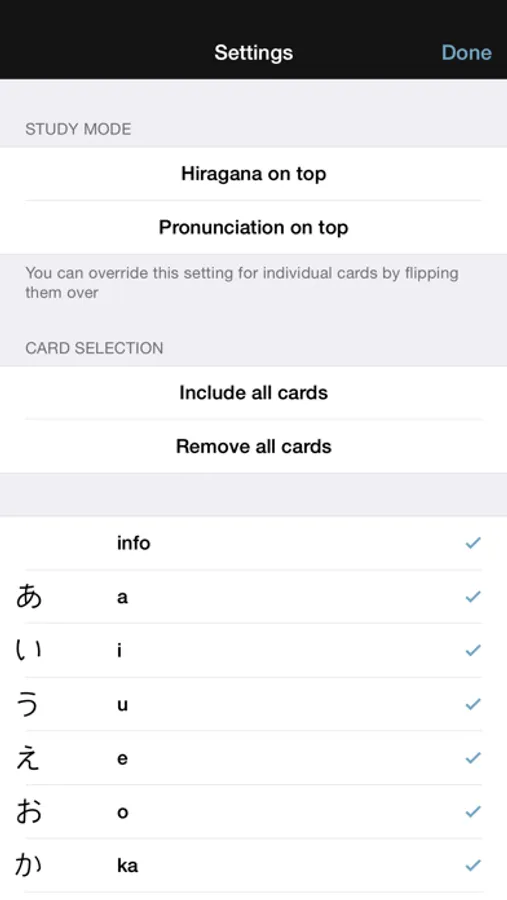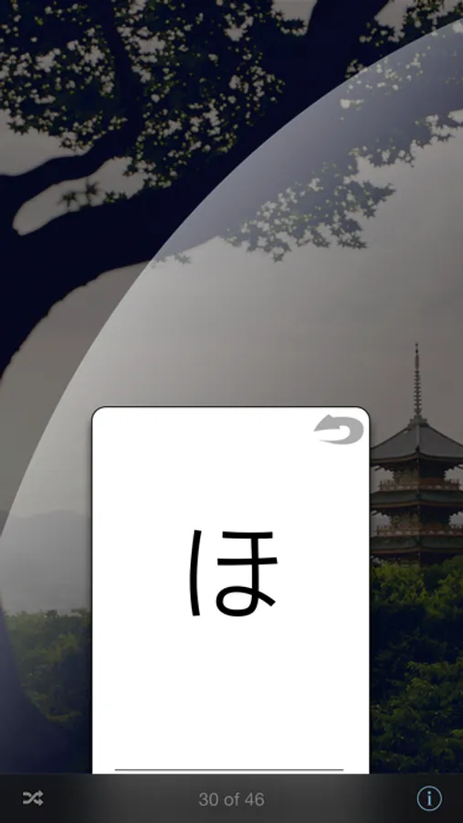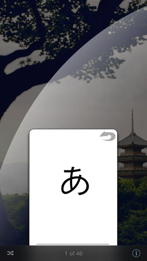 Hiragana Lite contains the 46 basic Hiragana characters, a subset of all the characters available in the full version. You can select which characters you want to study.