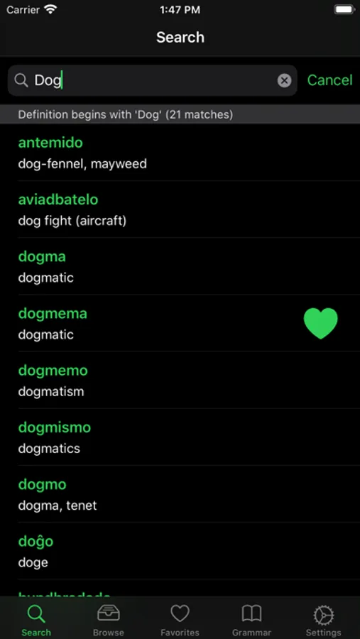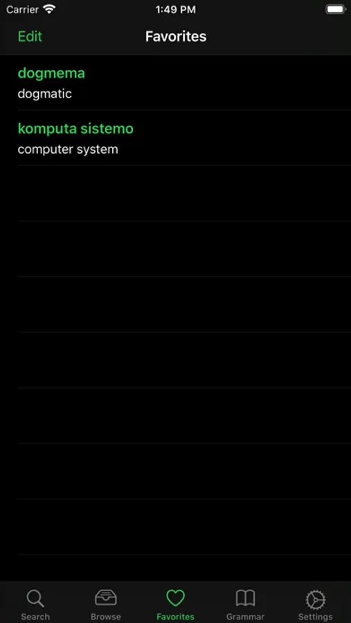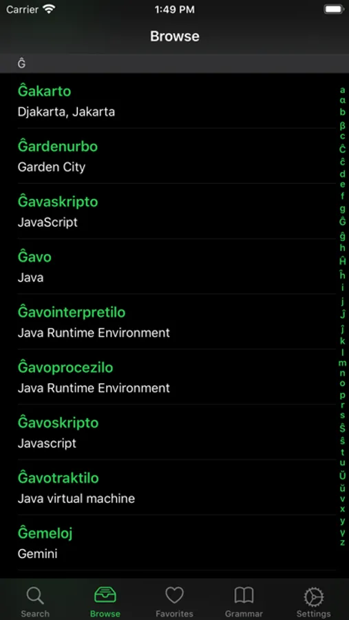 • Browse the built in dictionary organized by the Esperanto alphabet.