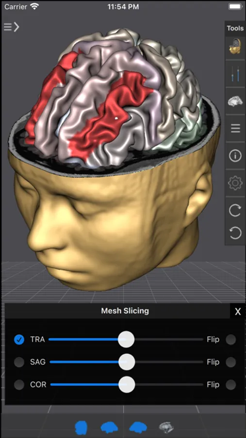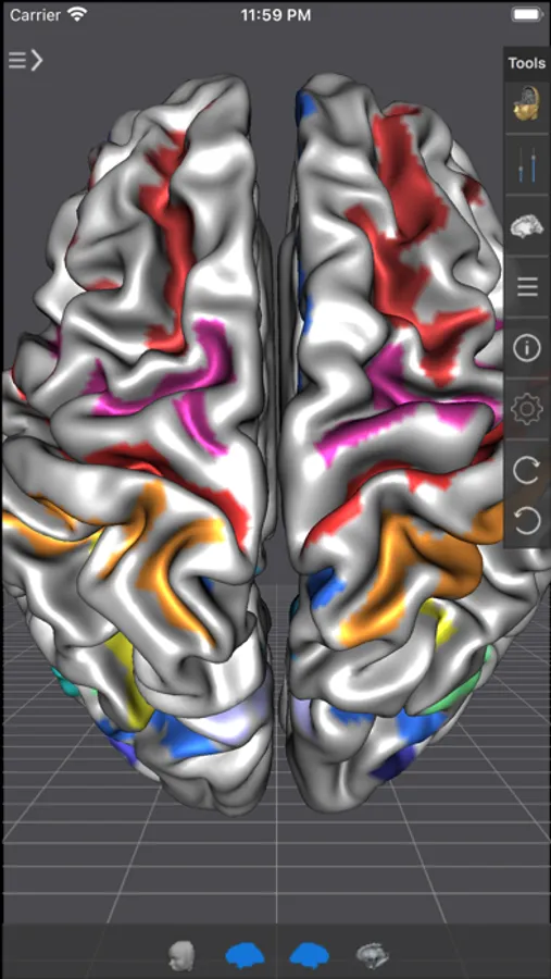* Select a 3D model (brain hemisphere, head) with the tab bar buttons at the bottom.