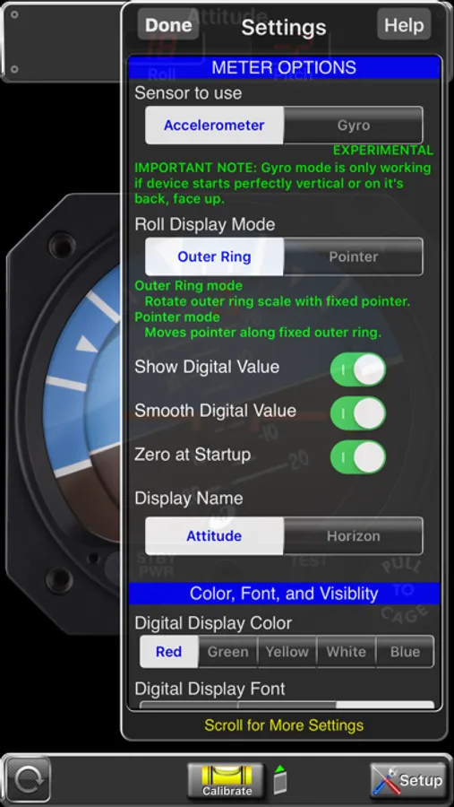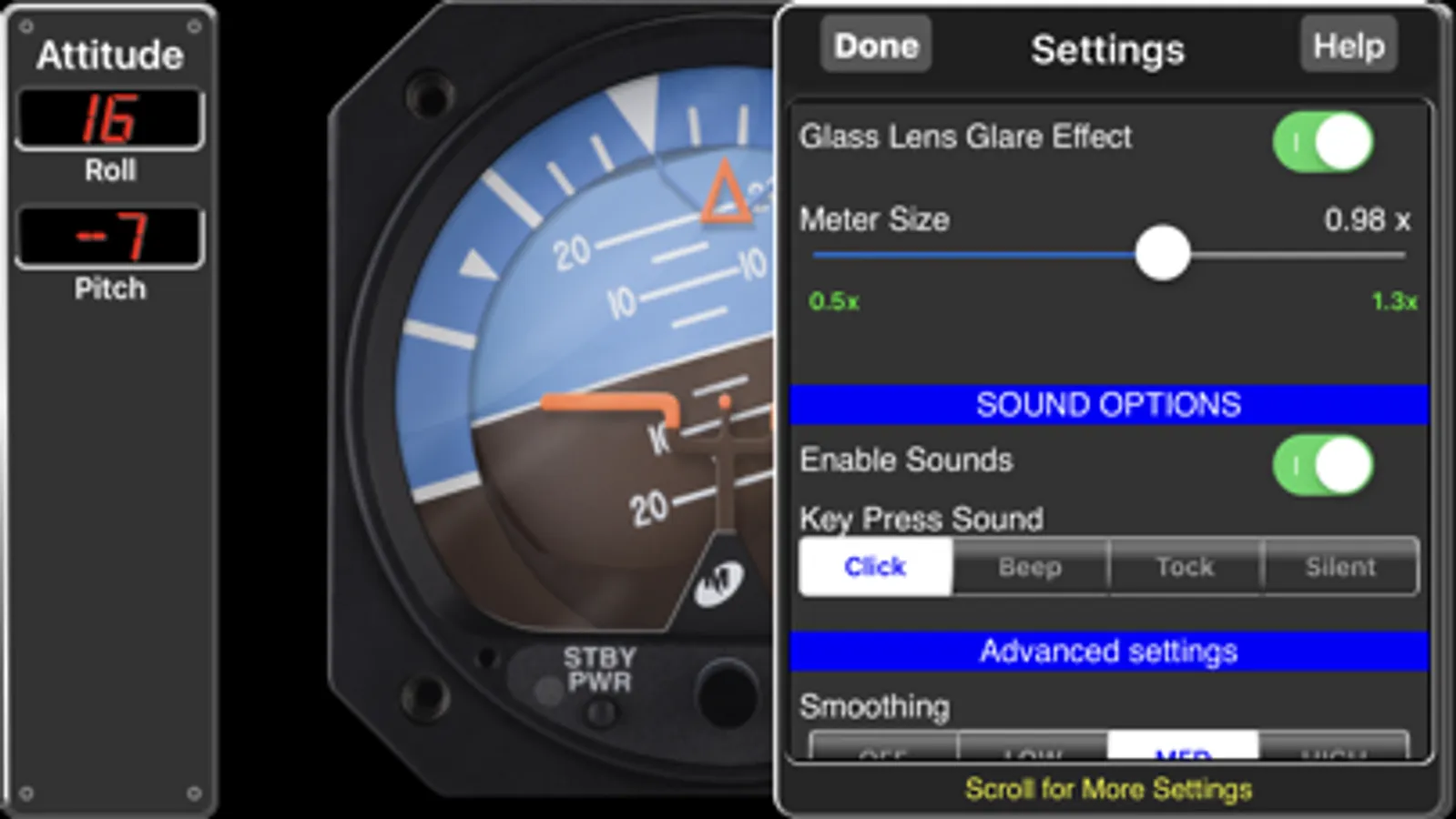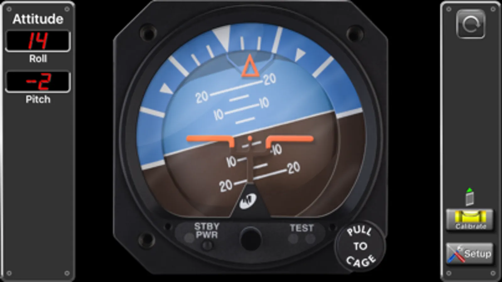 Pitch and roll angles are represented both with the analog instrument as well a digital display. The instrument can be zeroed and the pitch reference "wings" can be adjusted, just like the real instrument.