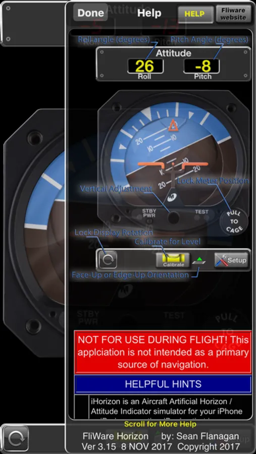This application is a photo-realistic aircraft Artificial Horizon indicator, also known as an Attitude Indicator, for your iPhone. Has a resettable zero and the movement is super smooth and realistic.