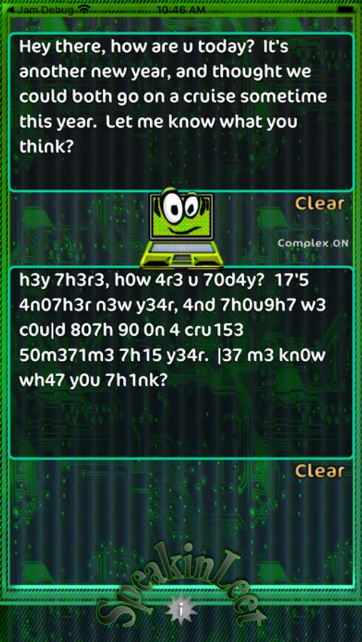 H3||0, Speakin Leet is an application that allows you to send messages in a computer script language. The "l33t speak" language was used for a variety of purposes before the internet became mainstream. In just a few taps, you can translate and share a message quickly and easily. Use this app to send messages in the encrypted language and impress your tech savvy friends!