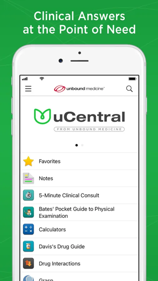 Content available through uCentral includes: 5-Minute Clinical Consult, Johns Hopkins Guides, Washington Manual of Medical Therapeutics, Bates' Pocket Guide to Physical Examination and History Taking, Taber’s Medical Dictionary, Davis’s Drug Guide, McGraw-Hill’s Diagnosaurus, Davis’s Laboratory and Diagnostic Tests, Diseases and Disorders, Clinical Evidence, Pocket Guide to Diagnostic Tests, 5-Minute Emergency Medicine Consult, 5-Minute Pediatric Consult, Harrison’s Manual of Medicine, STS Cardiothoracic Surgery E-Book, APSA Pediatric Surgery NaT, Red Book, and more.