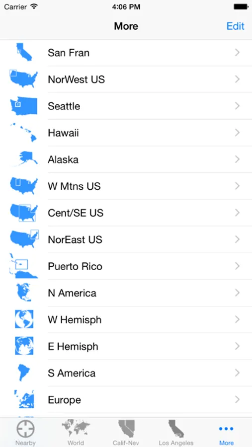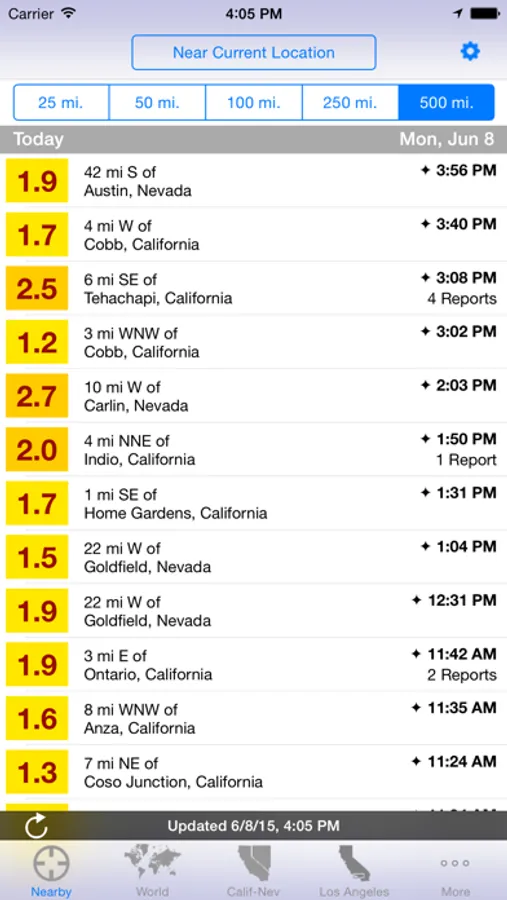 In addition to 20 region-specific event listings around the world (visit support page for a complete list), iFeltThat features a Nearby region, which uses your current location as a center point. Add an unlimited number of center points from your Address Book to keep an eye on seismic activity near your family and friends (or your own hometown while you travel) down to magnitude 1.0 in the U.S. (4.5 elsewhere). Or set a center point from any event location around the world to monitor earthquake swarms within 500 miles of the center point.