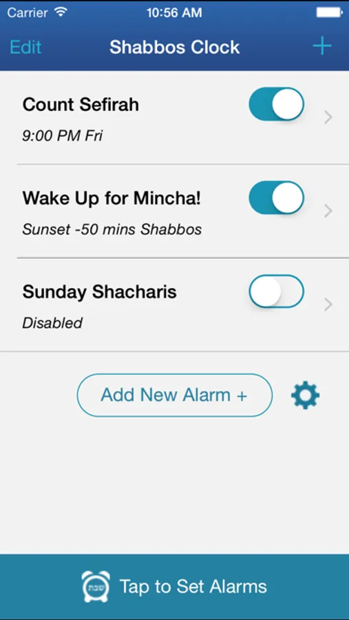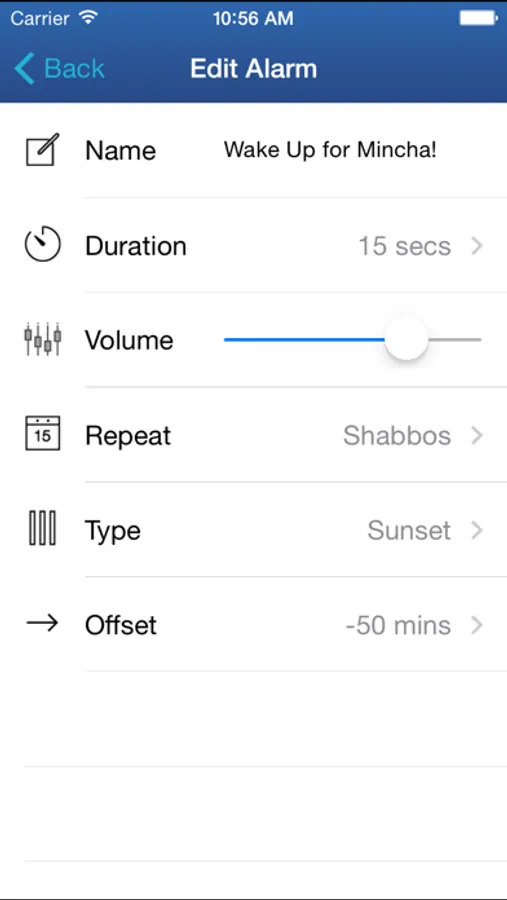 Important: For the alarm to be triggered, you must leave this application open. Closing the program or the iPhone will prevent the alarm from waking you up. Please also make sure your ringer volume is loud enough to wake you up. Make sure to plug in your device to prevent battery drain from not waking you up. Test BEFORE Shabbos to confirm your setup works.