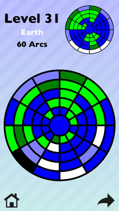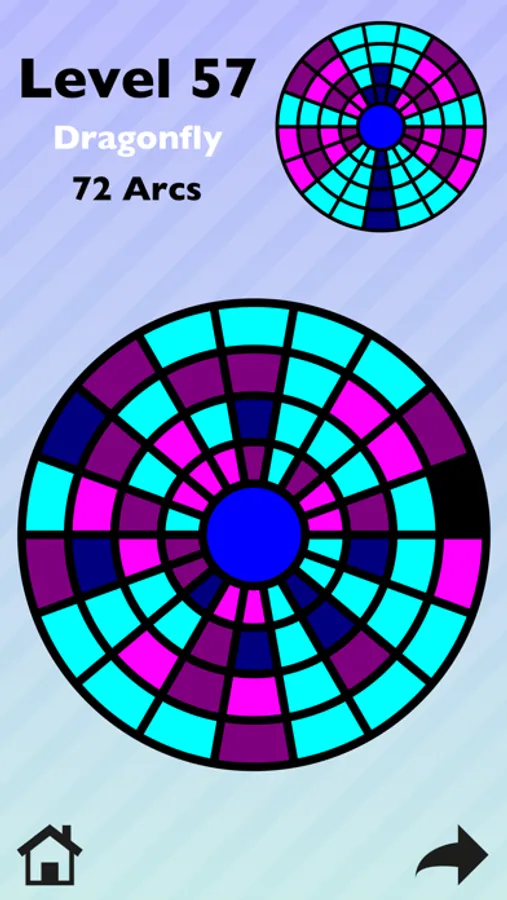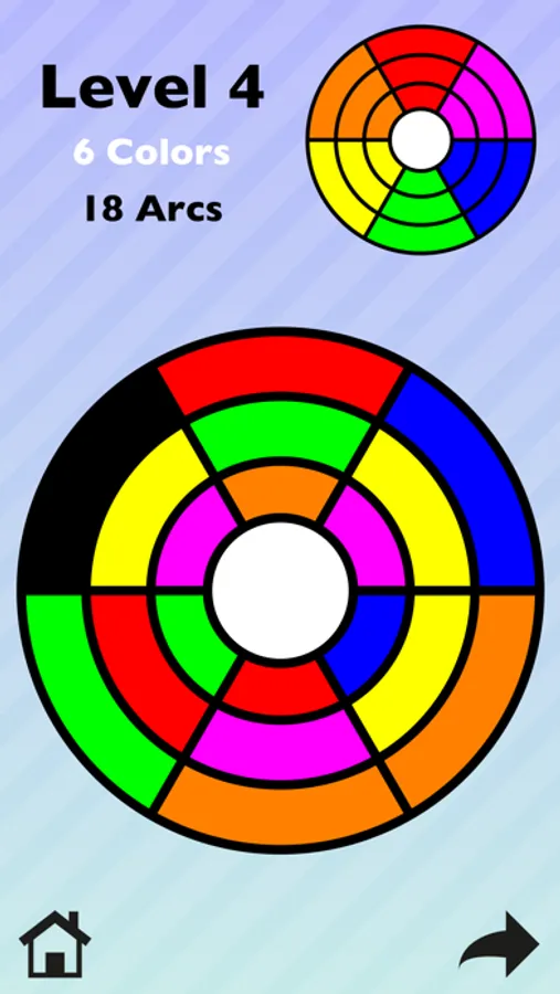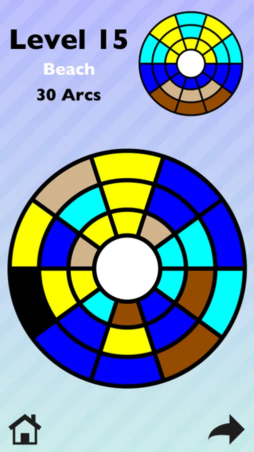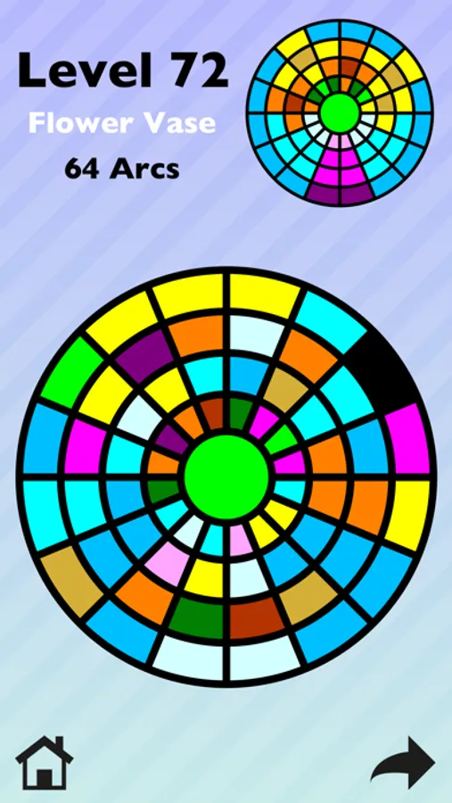 "A great game! Copy the color pattern in the sample circle by turning the rings. There's one black empty space. You push the arc you want to move onto into the empty space then turn the rings to reposition it. It's like one of those number 15 puzzle games only with a circle, arcs and pretty colors."
