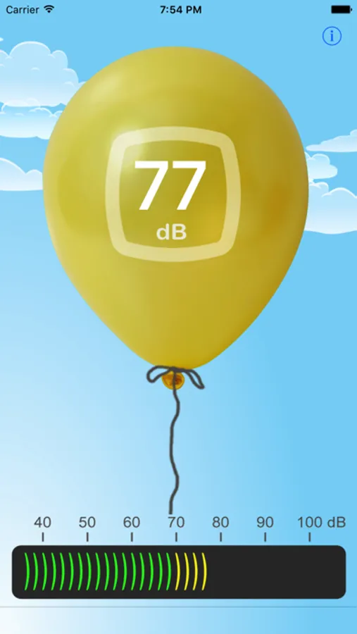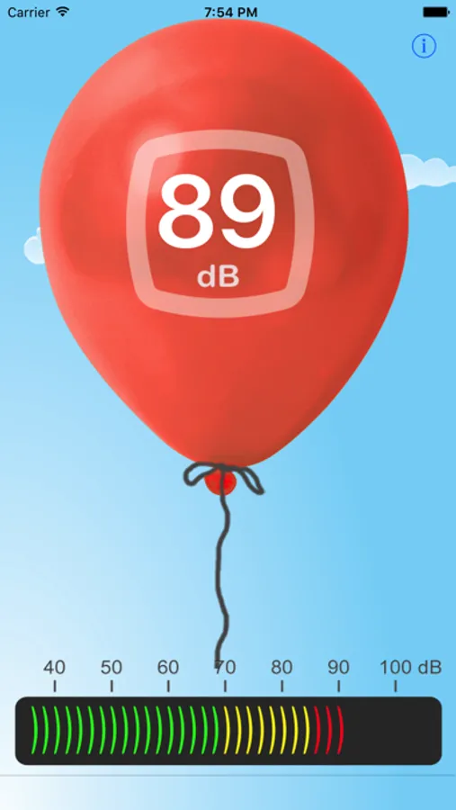 Sounds are also displayed visually as a balloon whose size and color change according to the level of the sound measured. See the balloon burst at high sound levels - you can also make it burst by creating a sharp, high sound, for an example by clapping your hands. Have fun experimenting!