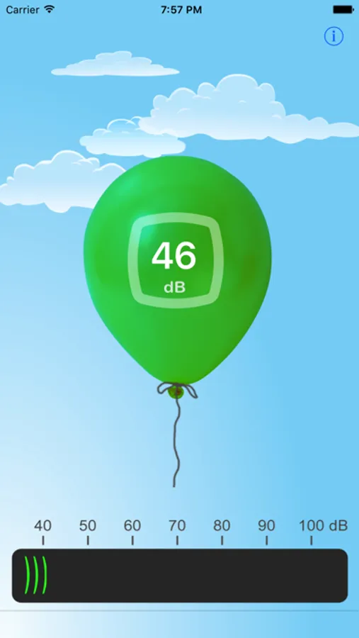 NoiseLevel uses your iPhone's built-in microphone to first pick up sound and then displays it in dB (= decibels) on a status bar at the bottom of NoiseLevel's main screen.