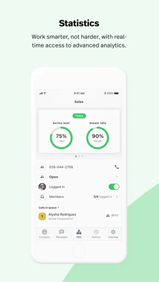 PBX services - Transfer calls to both colleagues and external numbers. You can toggle active calls from you cell phone to your fixed extension and vice versa. As an administrator, you can open and close the PBX directly in the app and listen to your messages in shared voicemail boxes.