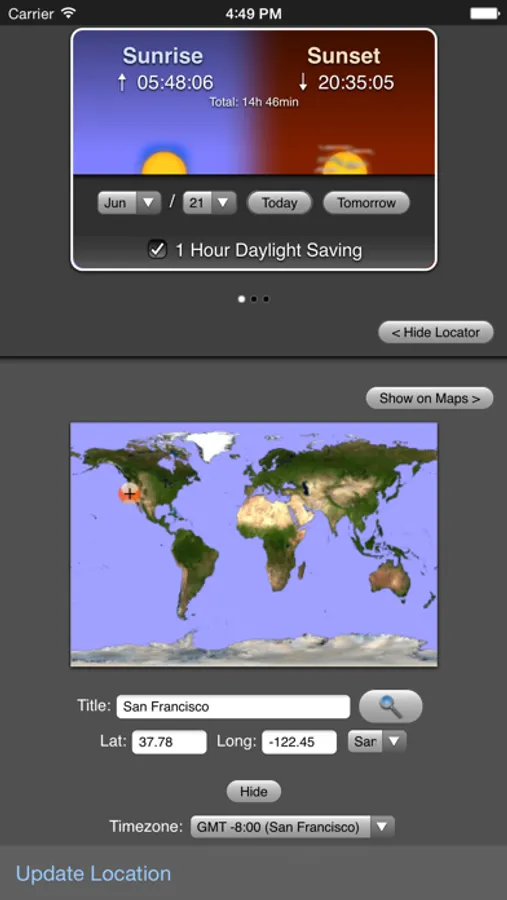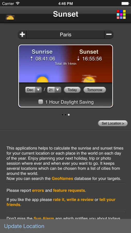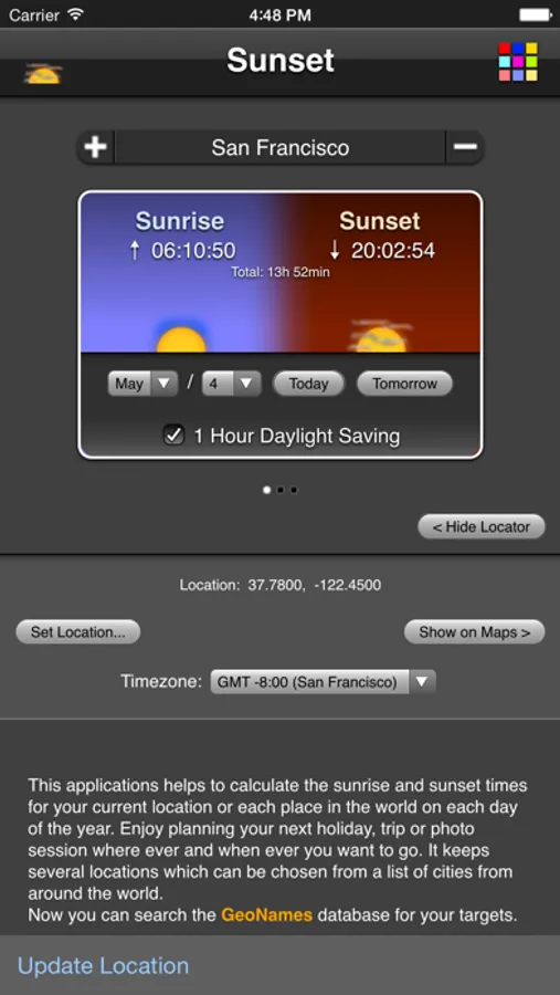 This applications helps to calculate the sunrise and sunset times of your current location or each location in the world on each day of the year. Enjoy planning your next holiday, trip or photo session where ever and when ever you want to go.