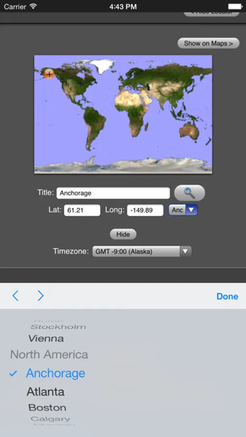 It keeps several locations which can be chosen from a list of cities from around the world or searched on GeoNames.org