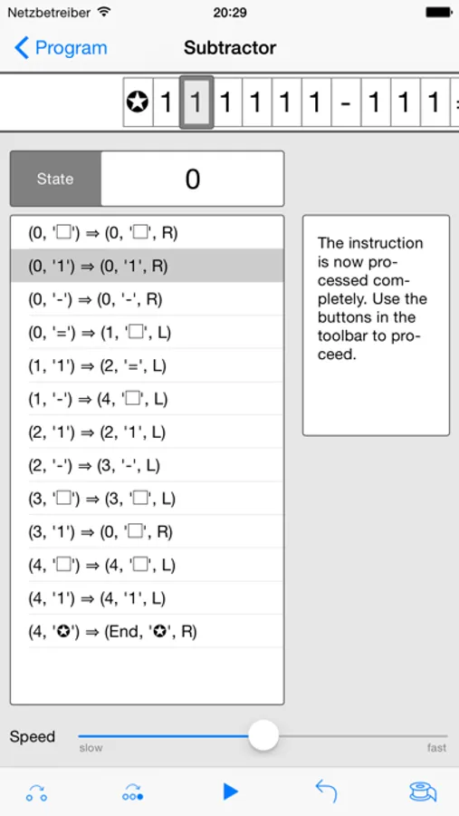 You can write new programs for the Turing Machine, execute them and analyze the execution even step by step. It's also possible to change the speed of the execution.