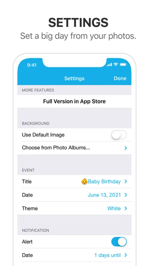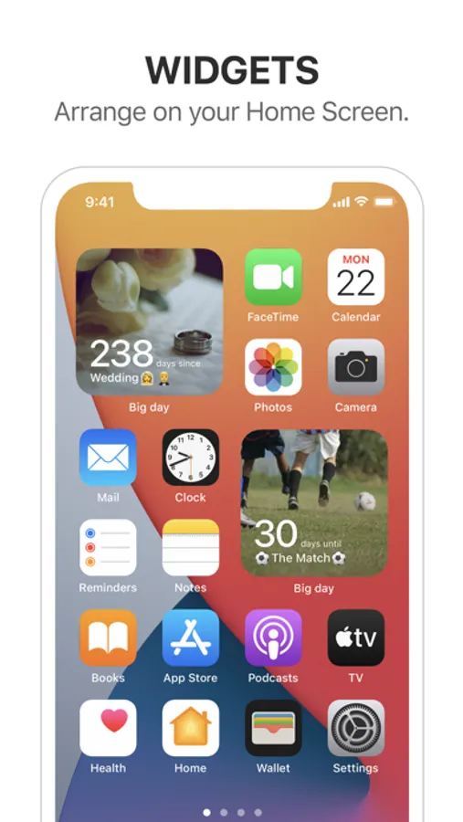 Big Day is a day tracking app and widget which tells you the remaining days until or starts counting the days after the event with your own photos. It is the simplest and the most beautiful way to track your big days.