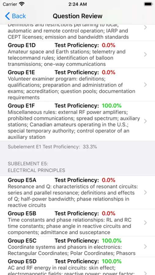 After completing your first practice exam, the question pool screen will display your proficiency in each question group for all practice exams you have completed.