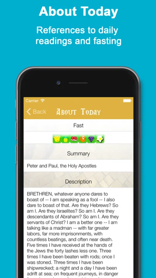 With a simple touch, you have a brief summary of how each day relates to the Orthodox religion. When viewing a day's details, you see all the Saints and Feasts for that day and what parts of the Bible to read. The fasting for each is specified as well.