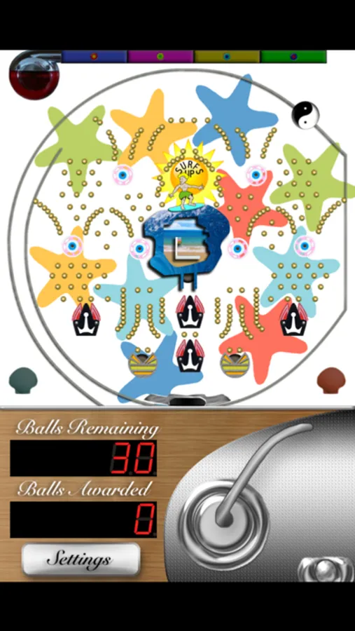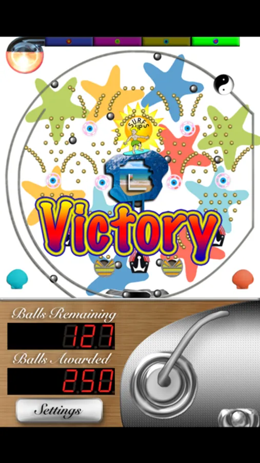 To play, move the lever downwards by swiping your finger over the lower section of the game from top to bottom and then lifting your finger to release the lever. How far down you pull the lever will determine how much force is used to launch the ball. The balls are launched up through the chute on the left and fall down from the top. You hit a jackpot when your ball falls into a “wing”, “drop bucket” or the center section of the game. The bank pays you with additional balls. When a ball enters a wing or the center section of the game, one or more wings will open. Wide open wings provide a much greater chance of a ball getting in to hit a jackpot.