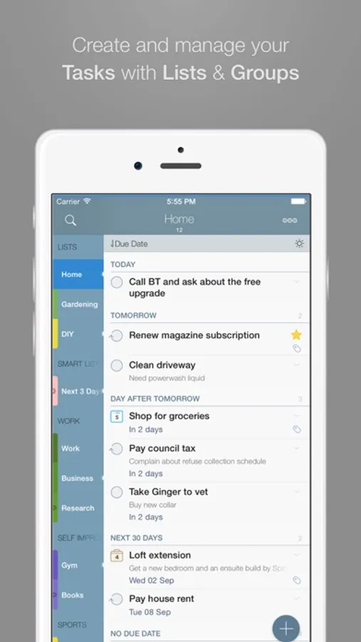 • Smart lists let you harness the true potential of 2Do using a number of search options, filters and search pre-sets. Using Smart Lists, you can create custom views of your tasks and use them to focus-in or find frequently managed tasks.