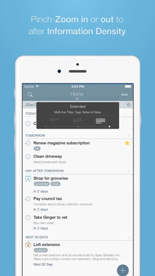 • Control the amount of information you wish to see with a simple pinch-to-zoom gesture, from single line titles to multiple lines of titles, notes and tags.