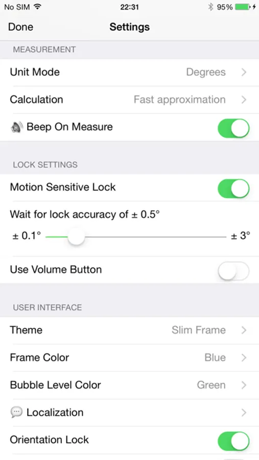 ◆ Motion-sensitive Lock feature: Besides the common instant simple tap hold mechanism you can activate the motion-sensitive lock. If activated the device waits for the final lock until you hold your device steady enough for at least 2 seconds. You can set the lock sensitivity between 0.1° and 1.0° degrees.
