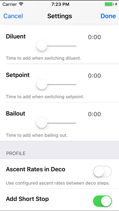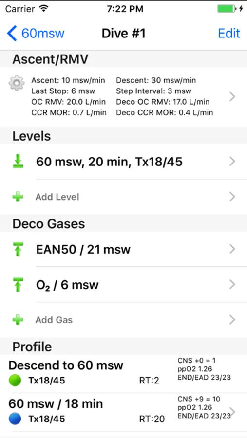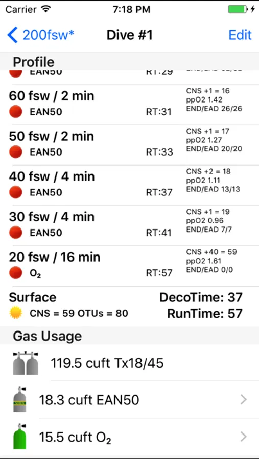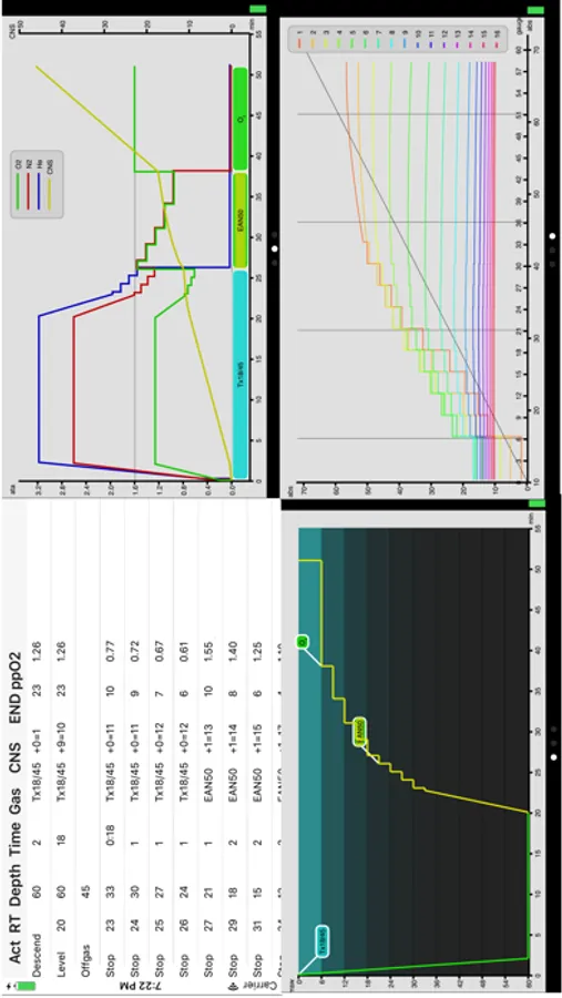 Keeps track of gas consumption, OTUs and CNS. Per dive configurable ascent/descent rates, last stop/stop interval settings and RMV/MOR. Any combination of OC and CCR planning is possible (CCR dives with OC levels/deco etc.).