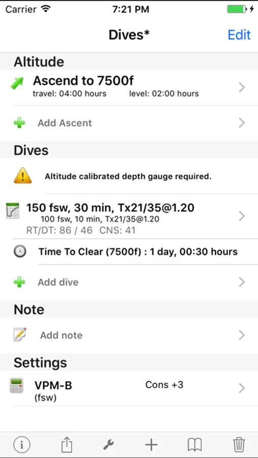 Dive plans can be stored in a bookmark folder for convenient reuse. Plans can also be exported via email or pasted into any other app.
