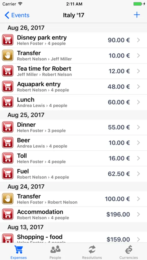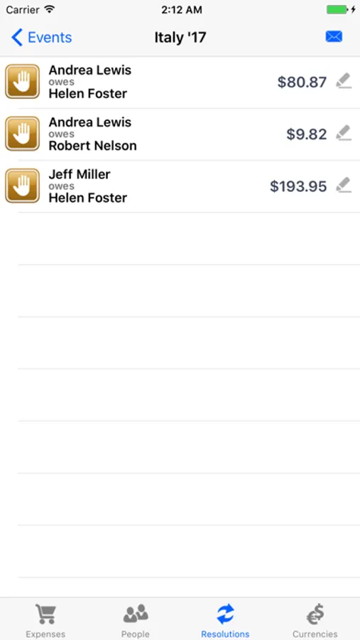 - resolutions screen automatically computing and displaying exactly who owes what to whom