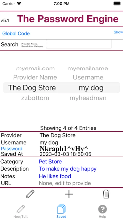 The Password Engine takes these measures to increase security: A global code is utilized to create your password based on the criteria you have specified. You choose the global and it's never stored anywhere and reenter it every time you run the application. If you change your code, the passwords generated will be different. Without this global code, the Password Engine will not have or be able to display your passwords. The actual passwords generated are never stored anywhere.