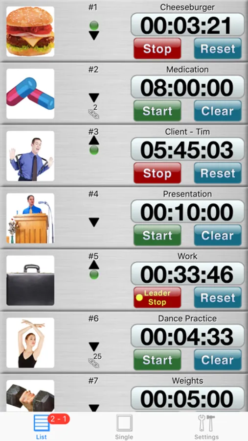 • Each of the 25 timers can count up or down and contains status indicators (up, down, active, alert, linked), a customized title, and a custom picture to identify each timer from your photo album or camera. Always see a running count of the number of active up and down timers. Timers that count up can start from any entered value. Reorder the timers as needed.