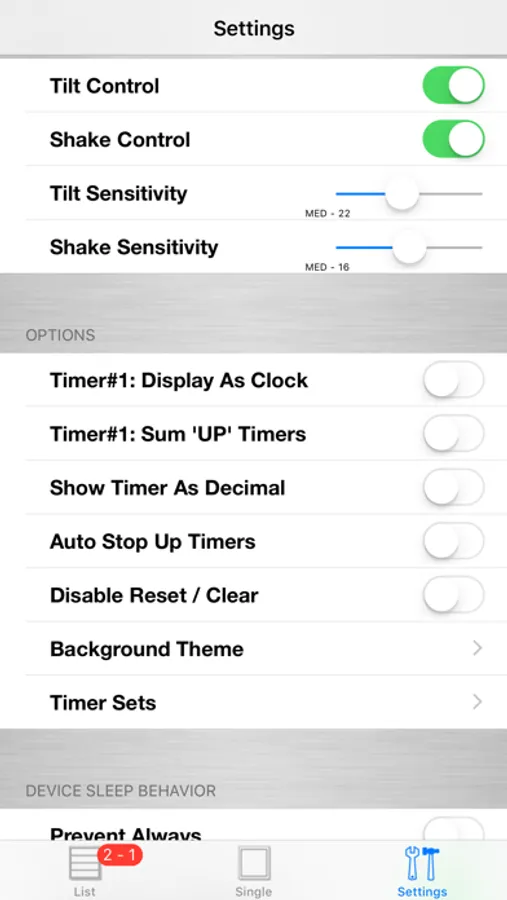 • Program settings include the ability to Stop/Reset/Clear all timers, start all ‘up’ timers, key clicks on/off, alarm volume, enable tilt/shake control, tilt sensitivity, shake sensitivity, replacing one timer with a clock, replace one timer with the sum of all UP timers, auto stop up timers (exclusive mode), show timer as decimal hours (normally hours : minutes : seconds), preventing the device from ever sleeping, preventing sleep only when actively counting down, popup background text alerts or audible alerts, disable reset/clear buttons, and help documentation.