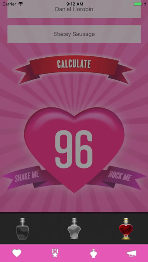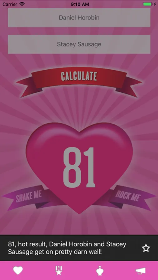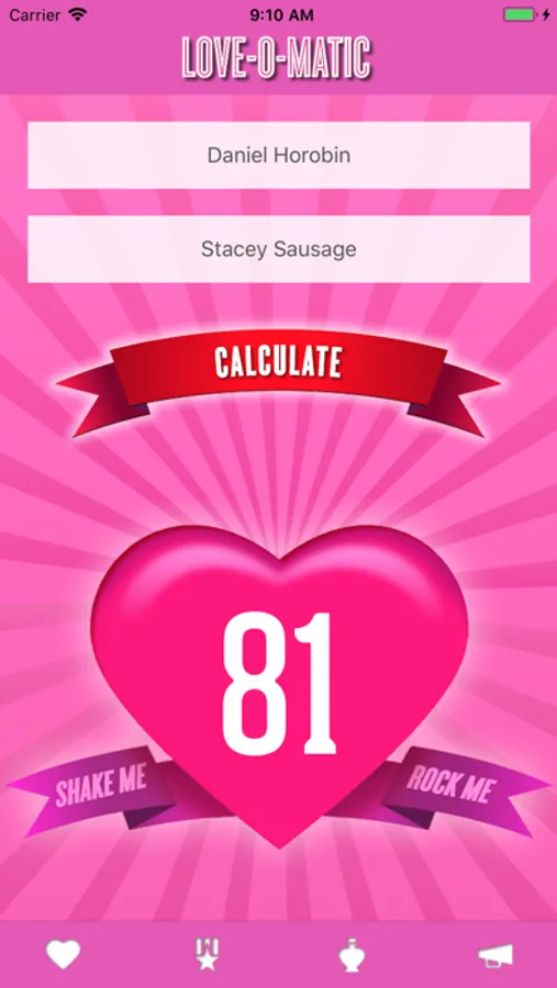 Shake the Love-O-Matic to get two random names straight from your Facebook and calculate the result!