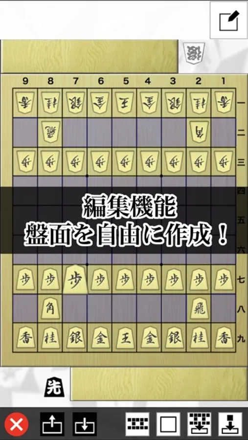 ・盤面編集機能。駒の配置を自由に編集し、その局面から対局を行うことが出来ます。盤面は複数本体に保存しておく事ができます。