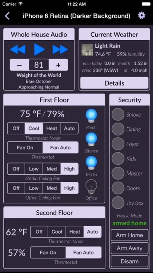 Indigo Touch is an iPhone, iPad, and iPod touch optimized App for remotely controlling lighting, appliances, HVAC, ceiling fans, sprinklers, etc., from anywhere in the world. It will automatically connect to the required Indigo Smart Home Hub software (v6 or better), installed in your home on a Mac, to communicate with Z-Wave, INSTEON and/or X10 compatible hardware. Additionally, many more devices and protocols are supported via 3rd Party Plugins. Now you can adjust your home's thermostat, run the sprinkler, open the garage door, unlock the front door, and turn off the lights from anywhere you have an internet/data connection!