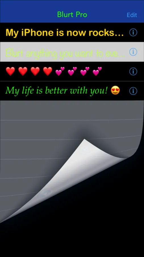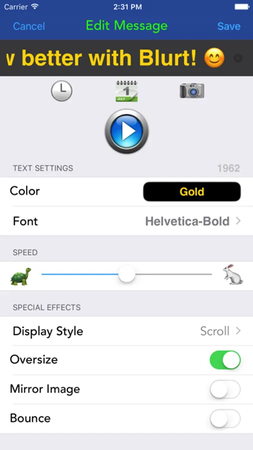 Blurt allows you to easily scroll large messages consisting of text, emoji, and photos. Perfect for concerts, sporting events, parties, bars, classrooms, conferences, or in the car. Swipe a playing message to toggle mirror mode so that the car in front of you can read your message, like "Your brake lights are not working", or "Your tire is flat". Or simply get someone's attention from across the room.